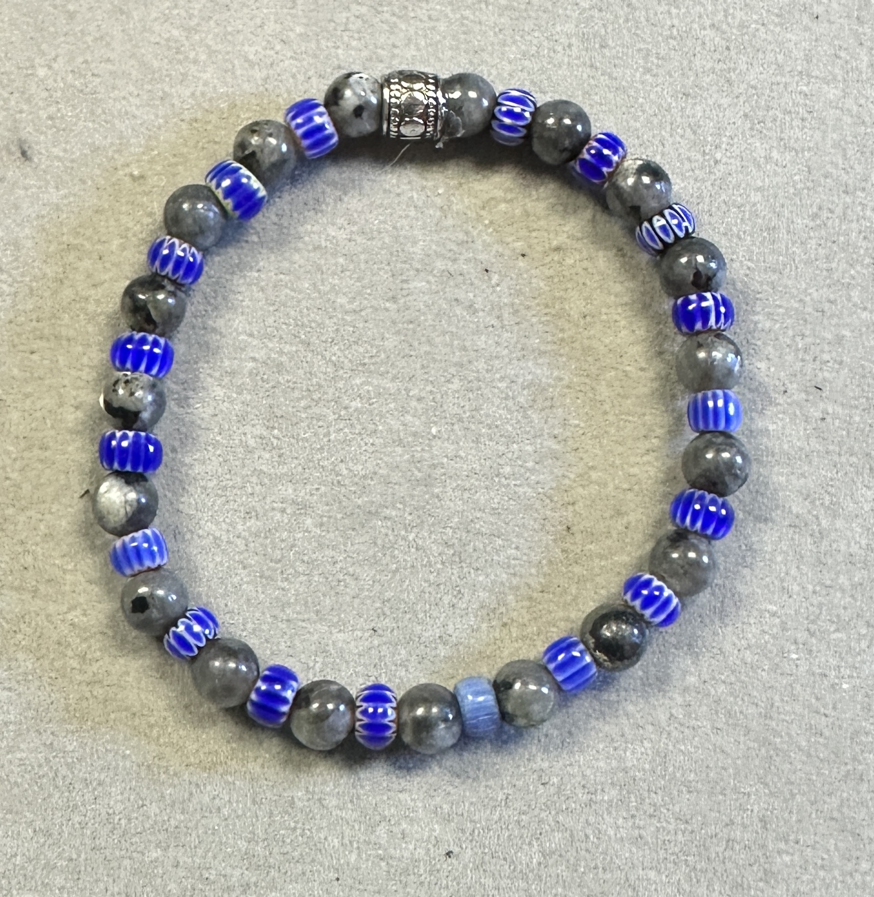 This handcrafted bracelet pairs the natural depth of Black Labradorite with the vibrant clarity of Blue Glass for a clean, modern contrast. The dark, polished stone provides a subtle, natural foundation, while the rich blue glass beads introduce brightness and visual pop.