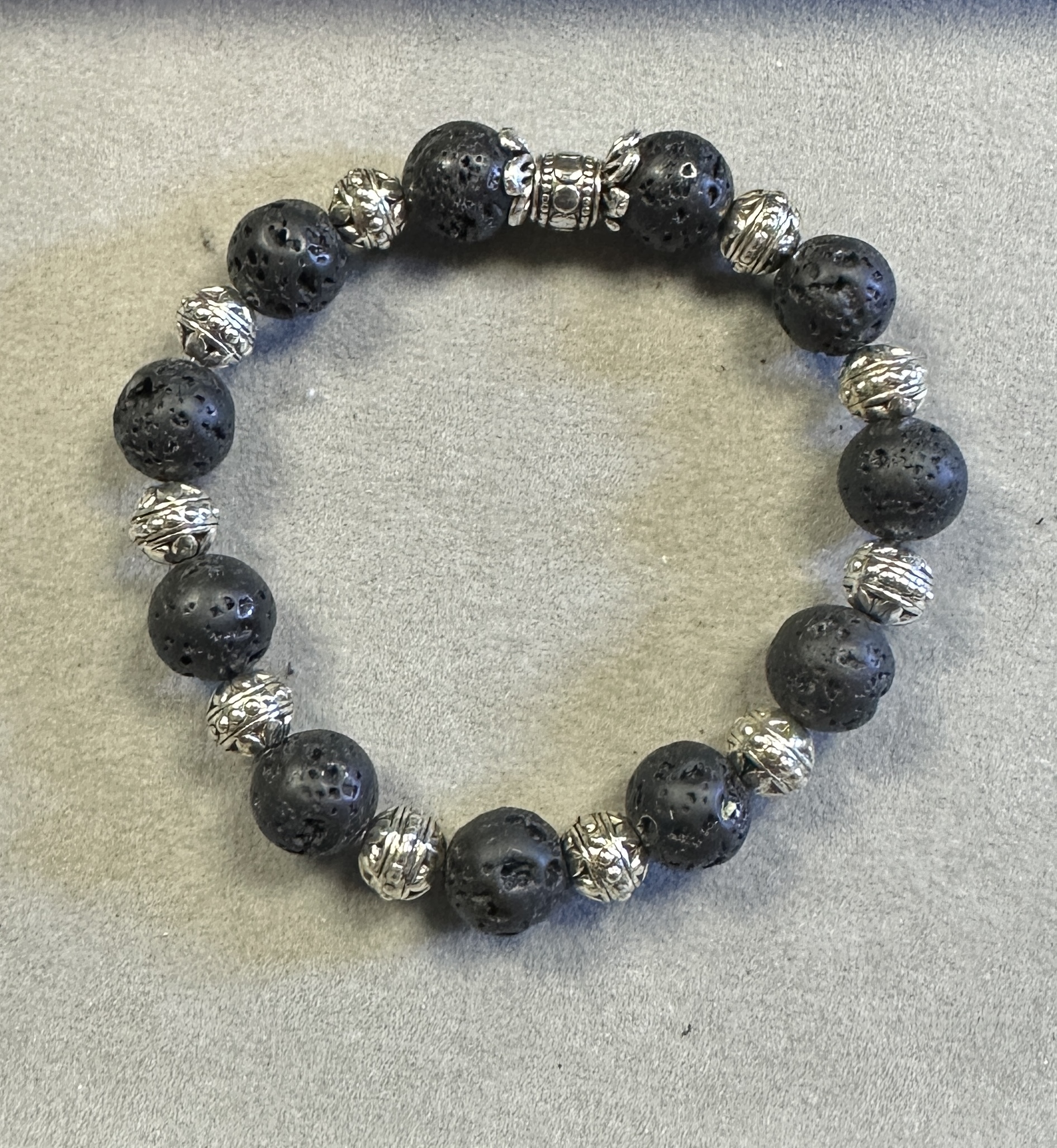Each 10mm Black Lava Stone bracelet with Tibetan silver bead is handmade by Marcus R. Geiser Sr at The Home Jewelry Bench inside Alexis Home.
