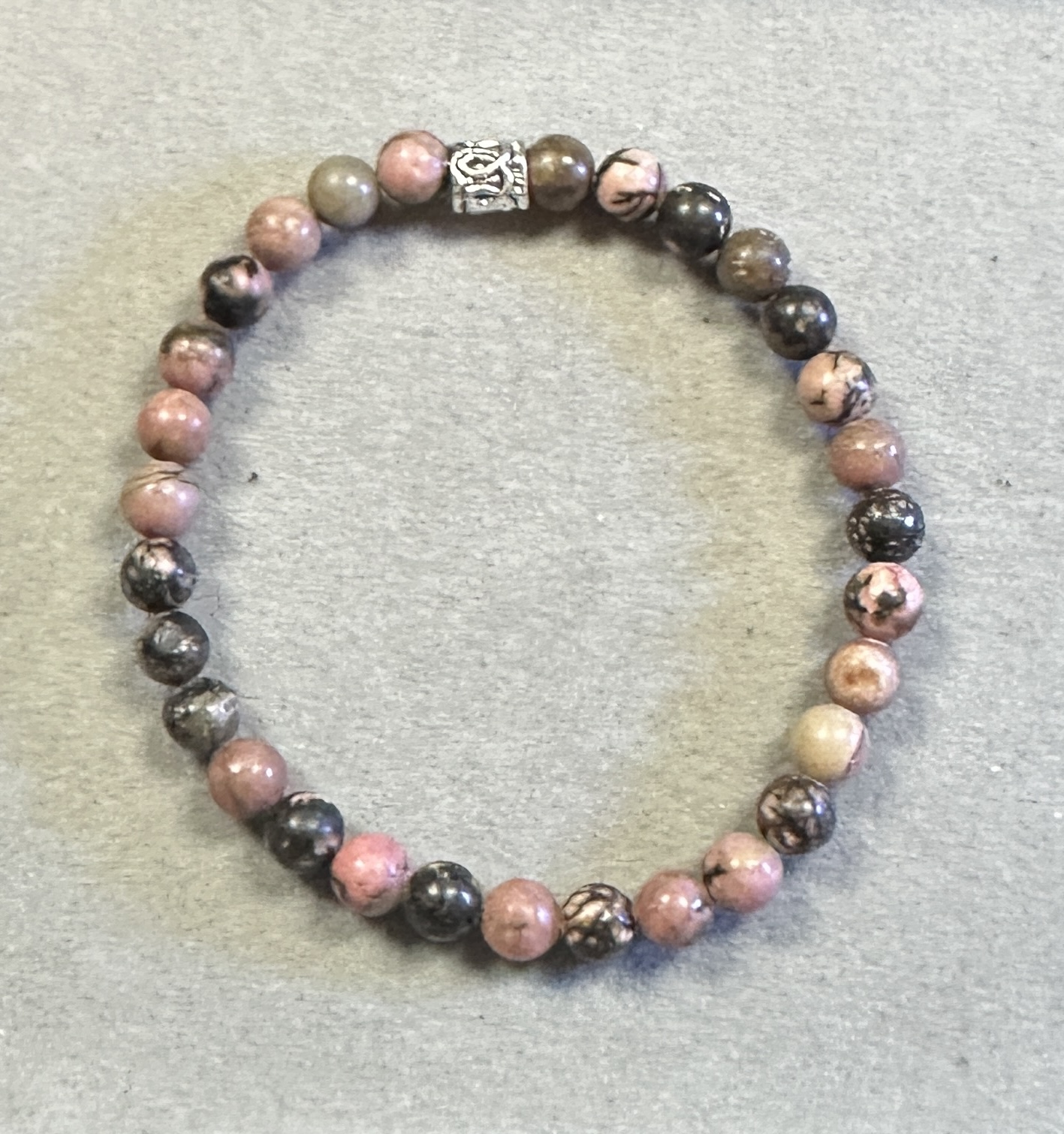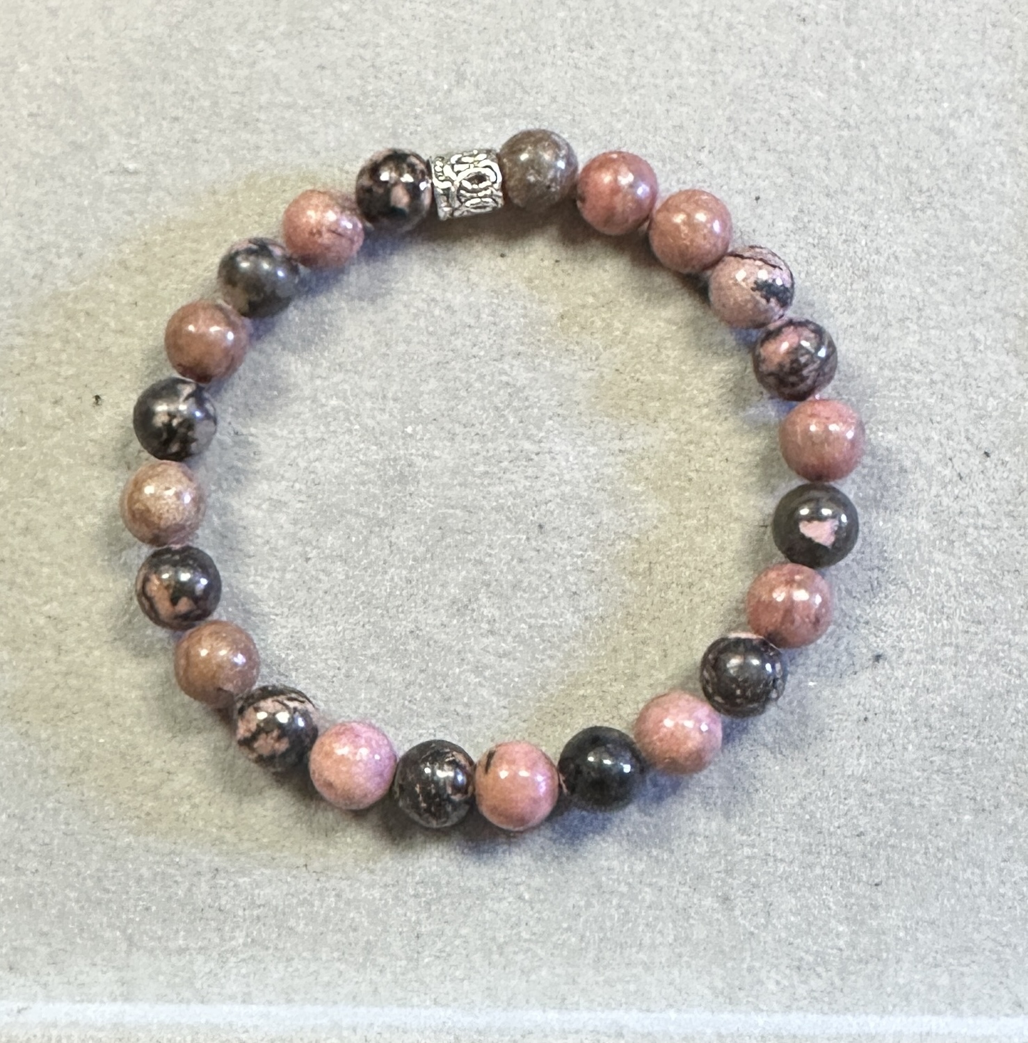 Rhodonite has long been associated with emotional balance, compassion, and inner healing, making this bracelet more than simple jewelry—it’s a wearable reminder of strength, resilience, and calm focus. The grounding presence of the black lace pattern enhances that symbolism, representing protection and stability during life’s transitions.