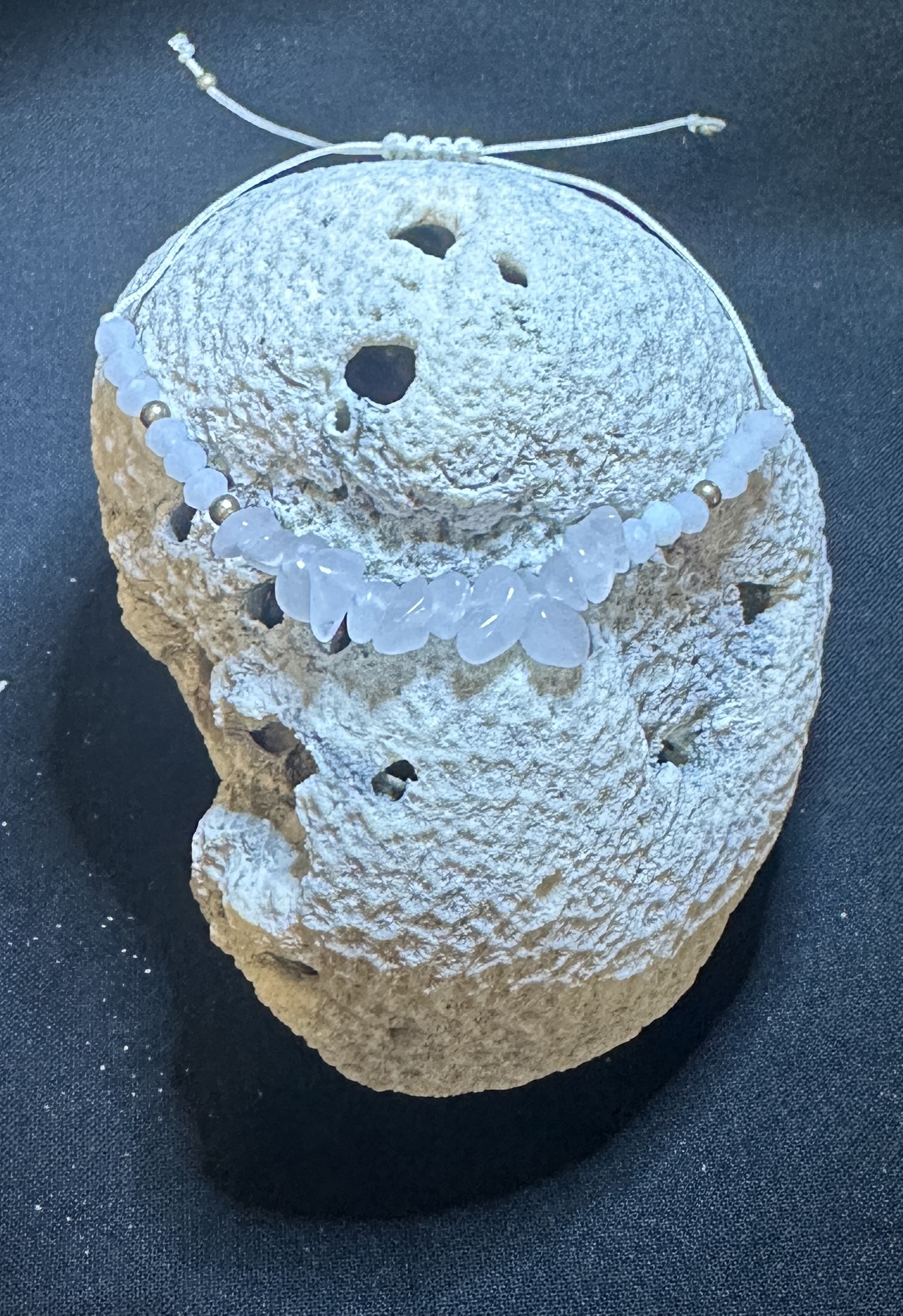 Each White Quartz string bracelet is handmade by Marcus R. Geiser Sr at The Home Jewelry Bench inside Alexis Home.