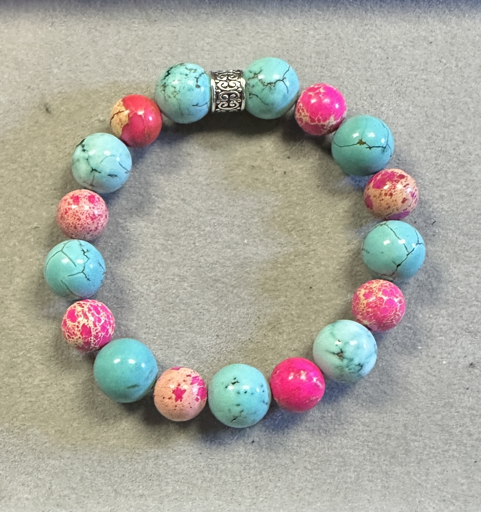 This bold, chunky bracelet features vibrant 10mm Pink Sea Sediment Jasper paired with substantial 12mm Howlite Turquoise beads for a striking, balanced look. The soft blush and coral tones of the sea sediment stone contrast beautifully with the calming blue veining of howlite, creating a piece that feels both earthy and expressive.
